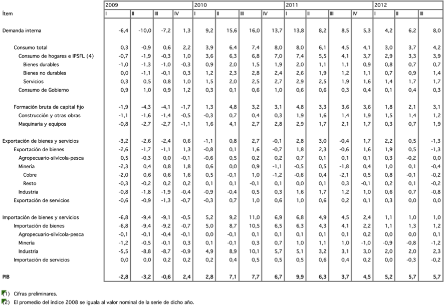 PIB Chile (2009 – 2013) 06 Saturday Jul 2013 Posted by chilealdesarrollo1 in Crecimiento y Desarrollo, Economia Social de Mercado, Uncategorized ≈ Leave a comment Crecimiento Económico: Es el principal engranaje para la superación de la pobreza. En la última fila aparece la evolución del agregado del Producto Interno Bruto (PIB) desde el último periodo del gobierno anterior. Share this: Click to share on X (Opens in new window) X Click to share on Facebook (Opens in new window) Facebook Click to email a link to a friend (Opens in new window) Email Click to share on LinkedIn (Opens in new window) LinkedIn More Click to share on Tumblr (Opens in new window) Tumblr Click to share on Pocket (Opens in new window) Pocket Click to share on Reddit (Opens in new window) Reddit Like Loading... Related